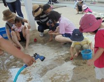 冷たいお水の感触を味わったり、スコップで川を作ったり、バケツやカップに入れたお水を