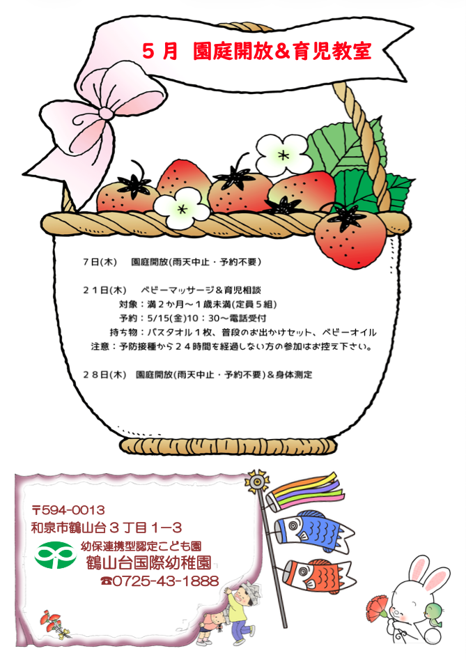 2026.04.24 5月 園庭開放&育児教室 5月 園庭開放&育児教室 5月 園庭開放&育児教室(PDFファイル) 投稿ナビゲーション 前の投稿2026年3月の活動(年長) 園庭・育児 年長クラスのページ 年中クラスのページ 年少クラスのページ 満3歳クラスのページ 2歳クラスのページ 1歳クラスのページ 0歳クラスのページ 情報公開 求人情報